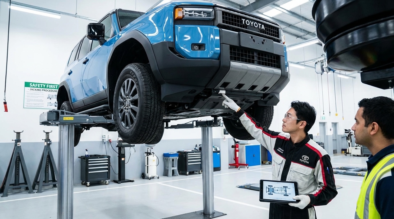 ランクル250は伝統的なラダーフレーム構造を採用しているため、一般的なモノコックボディの乗用車とはジャッキを掛ける位置が異なります。